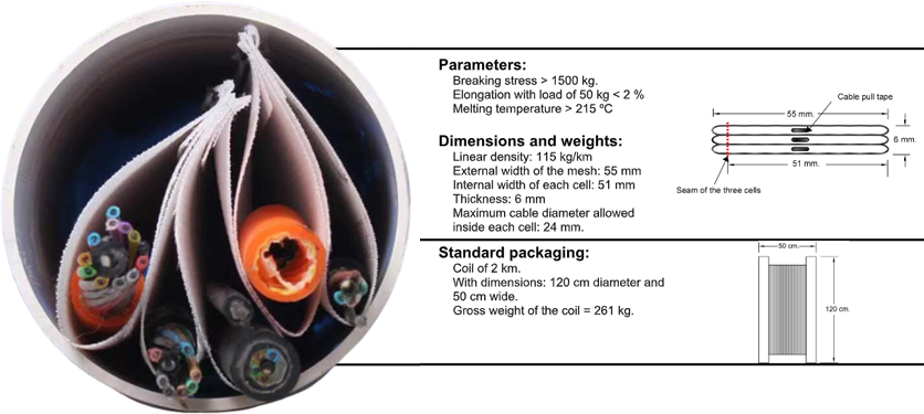 One of the objectives that our company has set is the advice and training of our customers to save costs in network deployments and laying fiber optic cables. With this three-cell textile mesh we reduce the need for space in the ducts and keep the cables aligned and organized inside the duct.